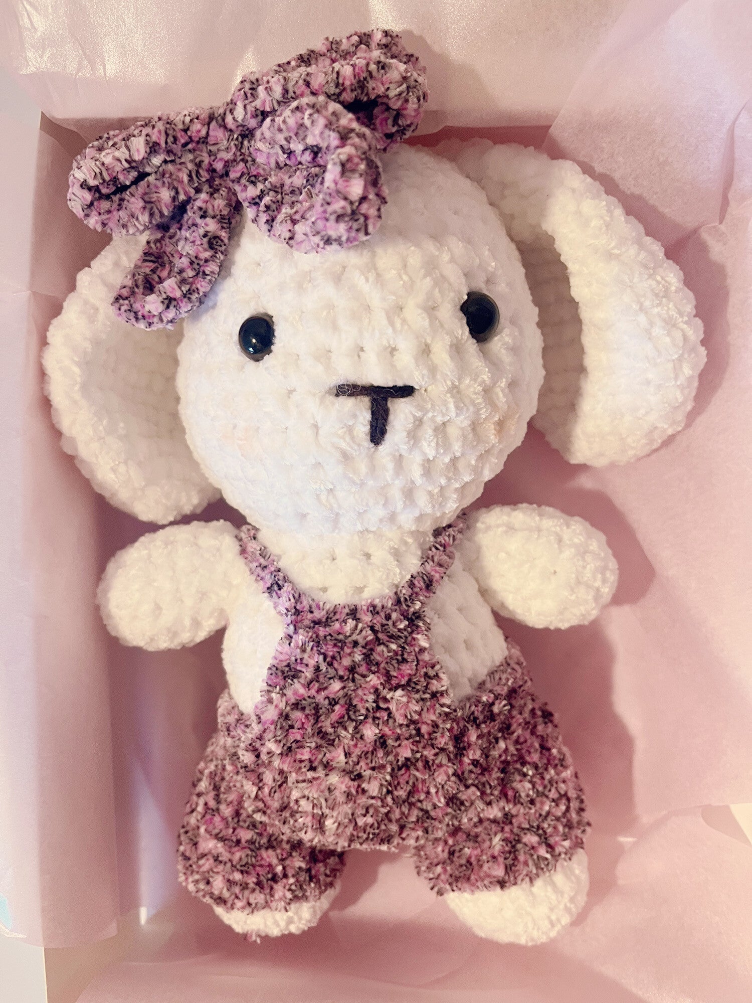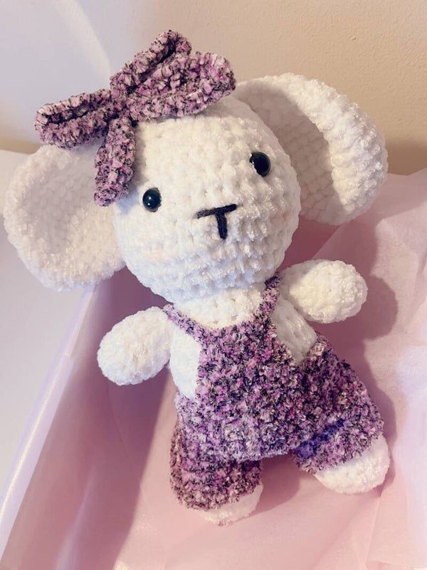 Adorable coneja de 23cm con vestido y lazo o con peto, elige el diseño que te guste. Tejida a crochet con hilo de chenille y relleno sintetico. Súper suave y jugoso este muñeco es ideal para los más peques. La ropa se puede personalizar en el color que se quiera.