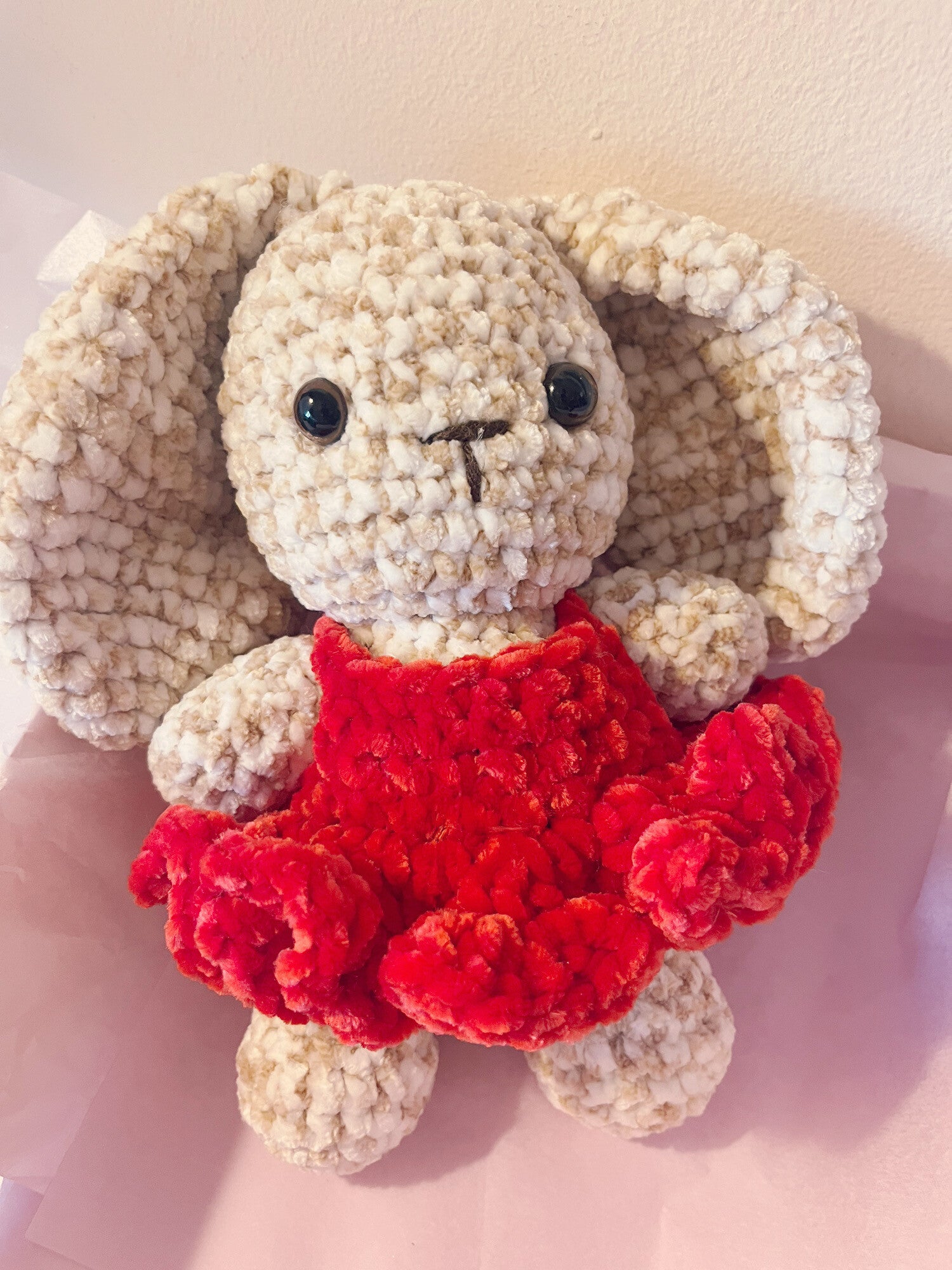Adorable coneja de 20cm con vestido tejida a crochet con hilo de chenille y relleno sintético. Súper suave y jugoso ideal para los más peques. La ropa se puede personalizar en cualquier color.